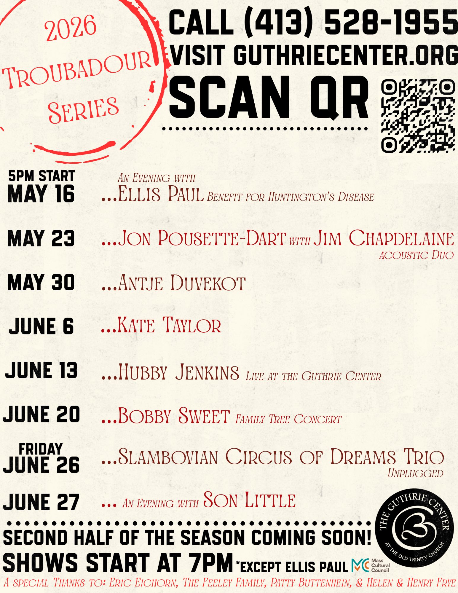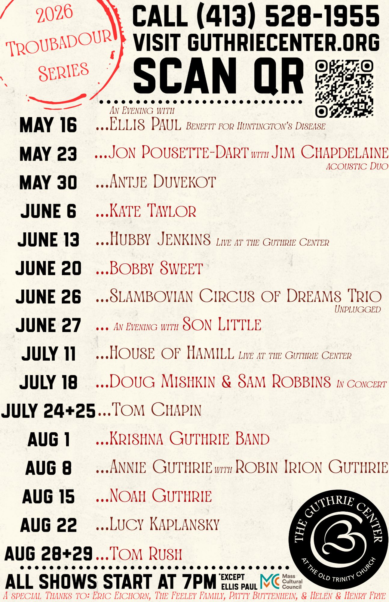 Arlo Guthrie sought to provide a place to bring together individuals for spiritual service, and founded the Guthrie Center, an Interfaith Church, in 1991. It fulfills Arlo’s aim to meet the ongoing needs of the community, and support cultural preservation and educational achievement. The Trinity Church where the song “The Alice’s Restaurant Massacree” began and where the movie “Alice’s Restaurant” was filmed, continues to service the local and international community.